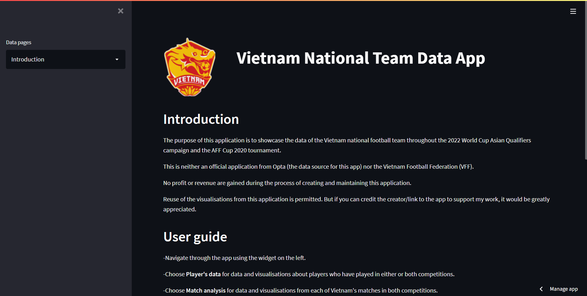 In between 2020 and 2022, when Vietnam men’s national team qualified for the third round of the World Cup Asian Qualifiers, I wanted to build a dashboard that could tell a story about that historic achievement of the team. Having been inspired by Football Manager’s latest feature, the Data Hub, I dug deep to find Python packages and libraries that could help me build a dashboard, and I came across Streamlit, which is where the dashboard is still being hosted to this day.